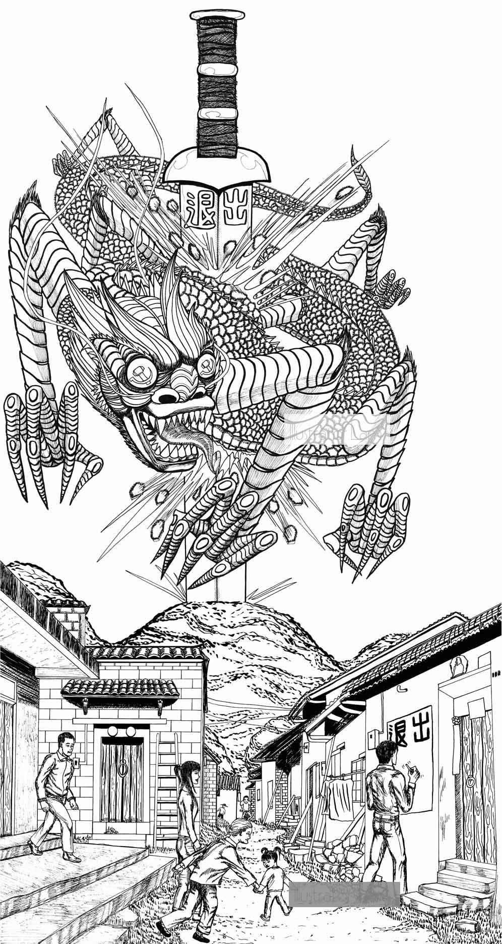 The dragon was the hardest to draw as there are no real dragons to reference from. I had to look at snakes and crocodiles and combine it with some paintings of Chinese dragons that I researched.