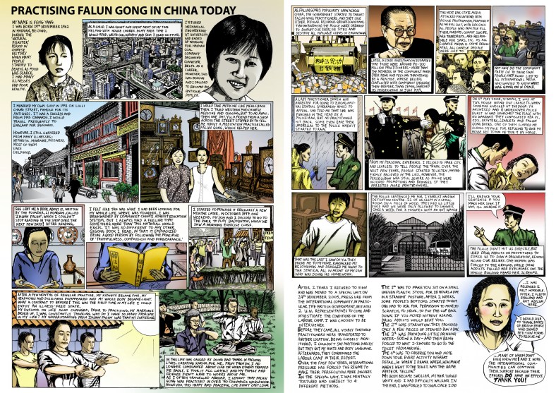 The strip is a biography of Annie Yang, a woman who was tortured in China for practicing Falun Gong until she managed to get asylum in the UK.