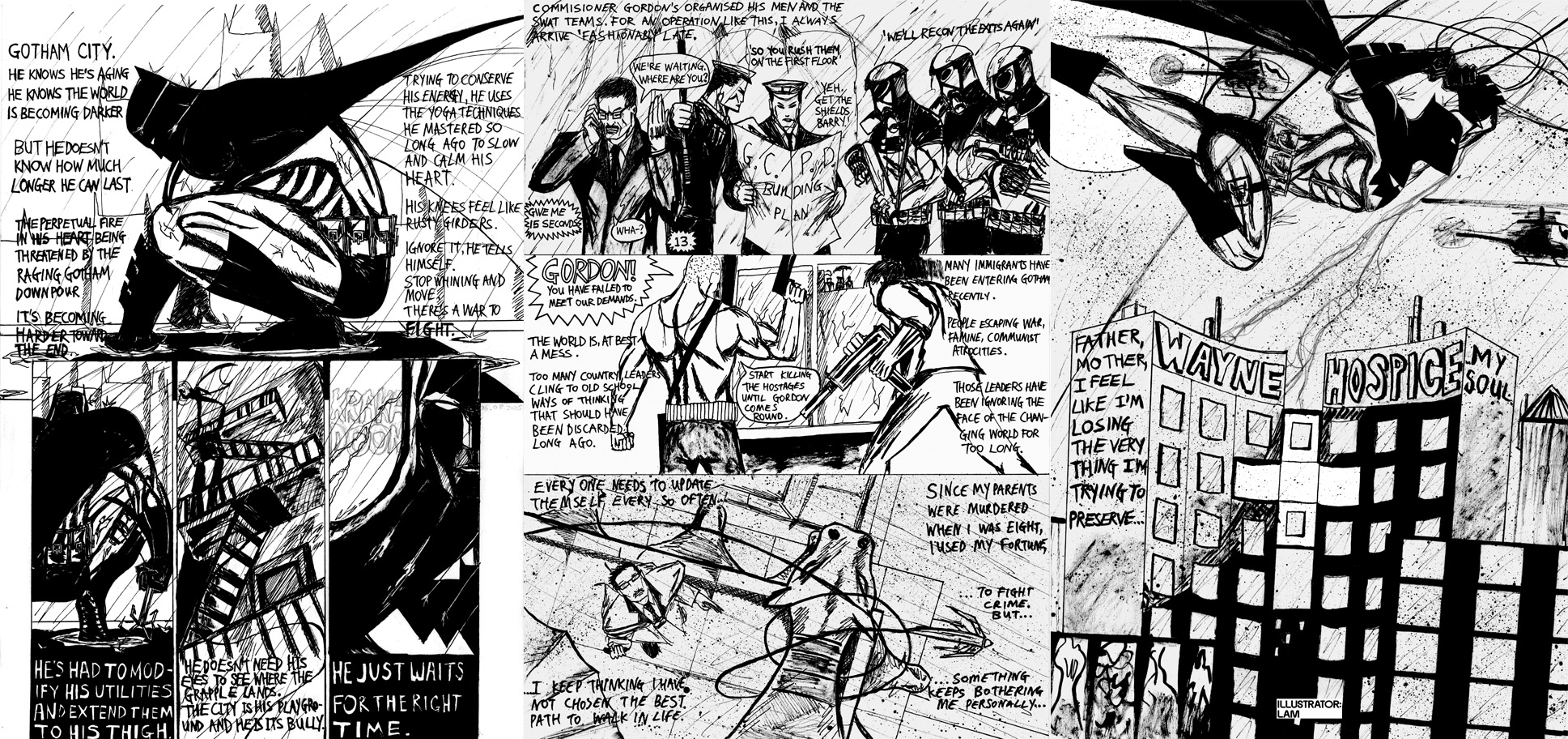 Some quick comic book sketches – Batman & Wolverine Posted on July 18, 2013 by Illustratorlam Here are some quick sketches after reading some comic books featuring these two. Click on the pics for larger version. They were drawn in pencil, pen, brush A short 3 page story featuring a few ideas and themes from Frank Miller’s Dark Knight Returns Share this: Click to share on X (Opens in new window) X Click to share on Facebook (Opens in new window) Facebook Click to share on Tumblr (Opens in new window) Tumblr Click to email a link to a friend (Opens in new window) Email Click to share on Pinterest (Opens in new window) Pinterest Click to share on LinkedIn (Opens in new window) LinkedIn Click to share on Reddit (Opens in new window) Reddit Click to share on Pocket (Opens in new window) Pocket Like Loading... Related