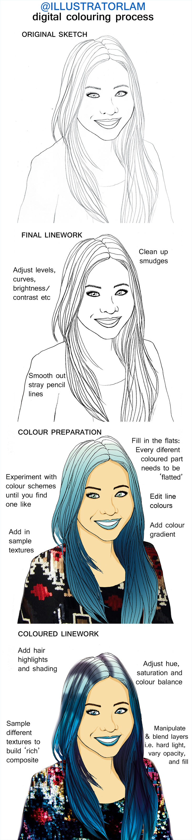 Happy New Year!!! It’s a bit late, but I’ve been busy working, so it’s all good. As soon as the new year came in, I was asked by a client to produce more portraits for their newsletters. Whilst producing them, I thought I would use one to show you a bit of the behind-the-scenes process of how I digitally colour, from pencils to final, I’ve annotated each stage with what I did. This design is my own and is separate to the portraits I was working on.